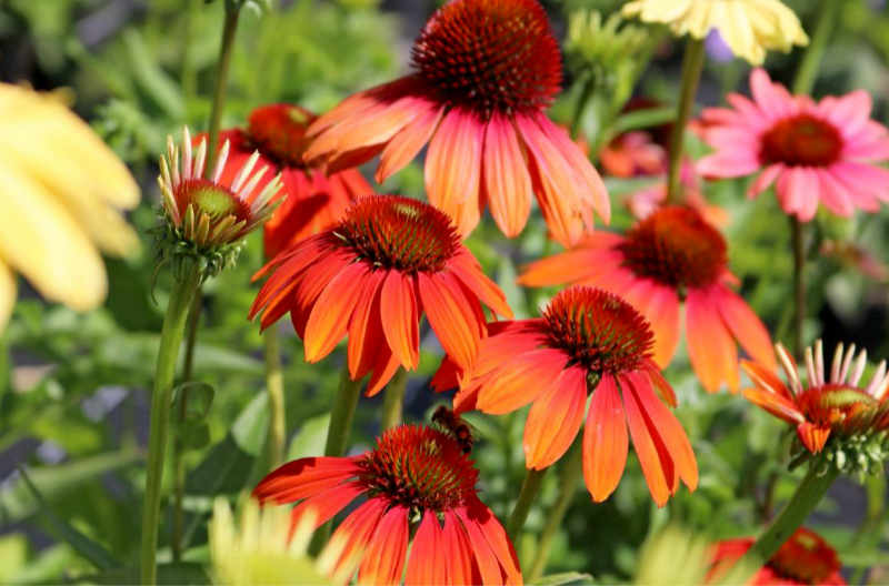 Die amerikanische Erdbeere der Sorte „Cheyenne Spirit“ bildet sonnige Blütentöne, deren Farben von scharlachrot, schillerndem Rot, intensivem Lila bis hin zu leuchtendem Gelb und leuchtendem Orange reichen. Die auffälligen Farben der robusten, großen Blüten kontrastieren mit den großen, braunen Zapfen dieser sonnigen Blume. Gerade wegen des vielseitigen und lebendigen Farbenspiels der Blumen ist die Sorte bei Gärtnern und Gärtnern sehr beliebt. Mit einer einzigen Staude können Sie eine wunderbare Farbenwelt in Ihrem Garten schaffen. Kombiniert man die Pflanze mit anderen blühenden Stauden, entsteht ein großes Spektrum an unterschiedlichen Blütenfarben und -formen. Pflanzen dieser amerikanischen Erdbeersorte werden bis zu 80 cm hoch. Wie die anderen Sorten blüht auch diese von Juli bis September. Die Pflanze ist mellifer, so dass wir viele Bienen und Hummeln auf ihr finden werden. Die amerikanische Erdbeere gedeiht auf lehmiger, gut durchlässiger Gartenerde. Er eignet sich für sonnige Standorte, die reich mit organischer Substanz gedüngt sind.