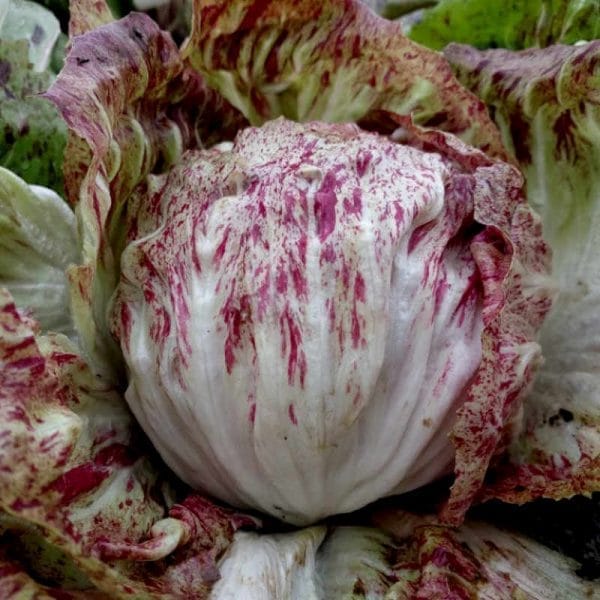 Chicorée, der einen runden Kopf mit weiß-roten Blättern entwickelt. Im Herbst eignet es sich für Salate, und im Winter zum Forcieren. Die Sorte gehört zu den Chicorée-Selektionen der Sorte Castelfranco. Chicorée wird im August gepflanzt und Anfang Oktober geerntet.