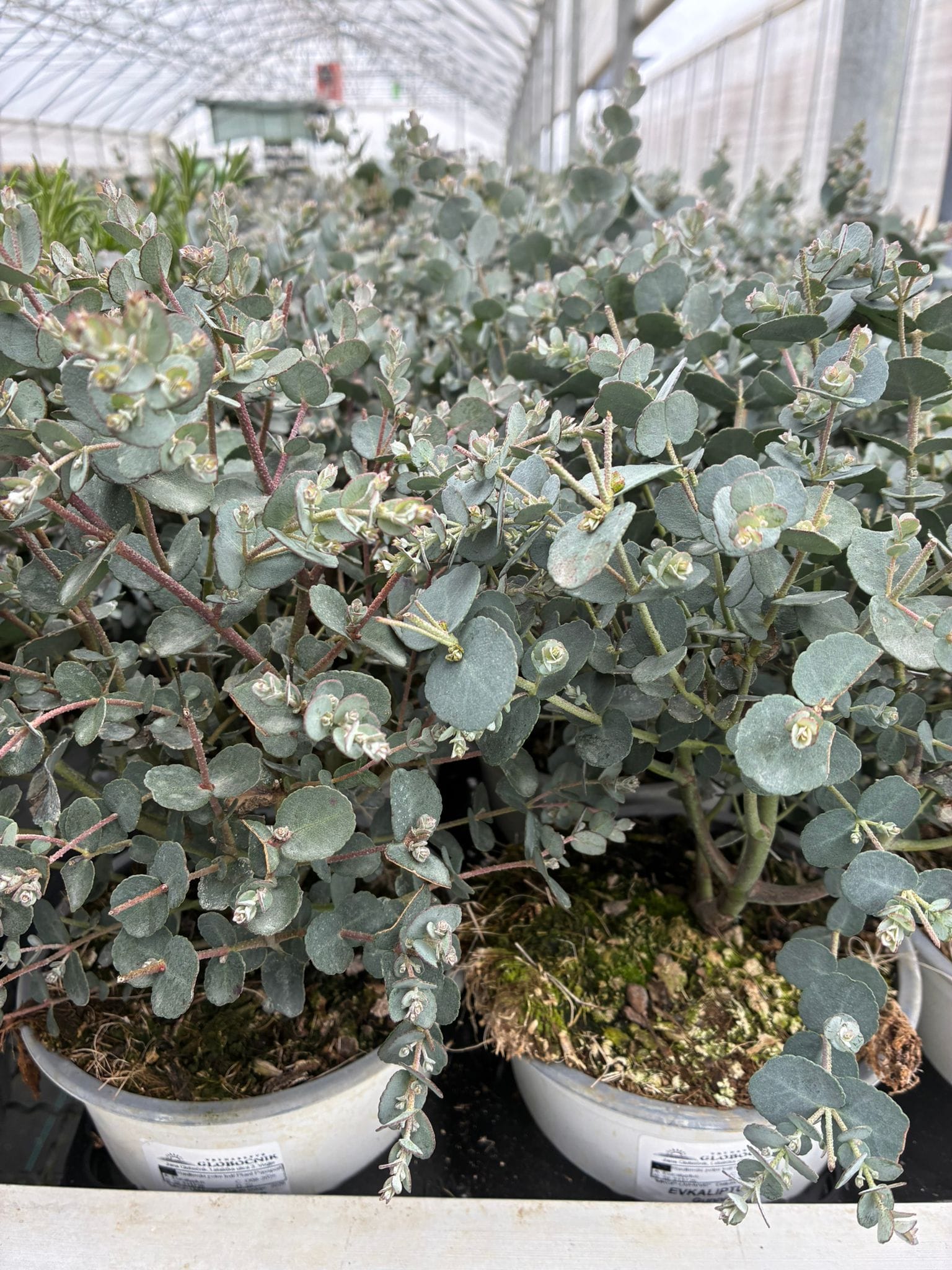 Evkaliptus je pokončno, hitro rastoče, v določenih podnebjih prezimno zimzeleno drevo. Rastlina je enostavna za gojenje. Listi so široko ovalni, gladki, srebrno sivi, dišeči.