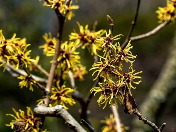 Rastlina doseže 2,5 do 4 metre višine in širine, raste počasi in razvija široko razvejano krošnjo. Njeni cvetovi so limonasto rumeni, nitasti, rahlo dišeči in se odpirajo na golih vejah že od januarja do marca, kar zagotavlja barvitost v zimskem obdobju. Listi so ovalni, temno zeleni, jeseni pa se obarvajo v zlato rumene in oranžne odtenke.