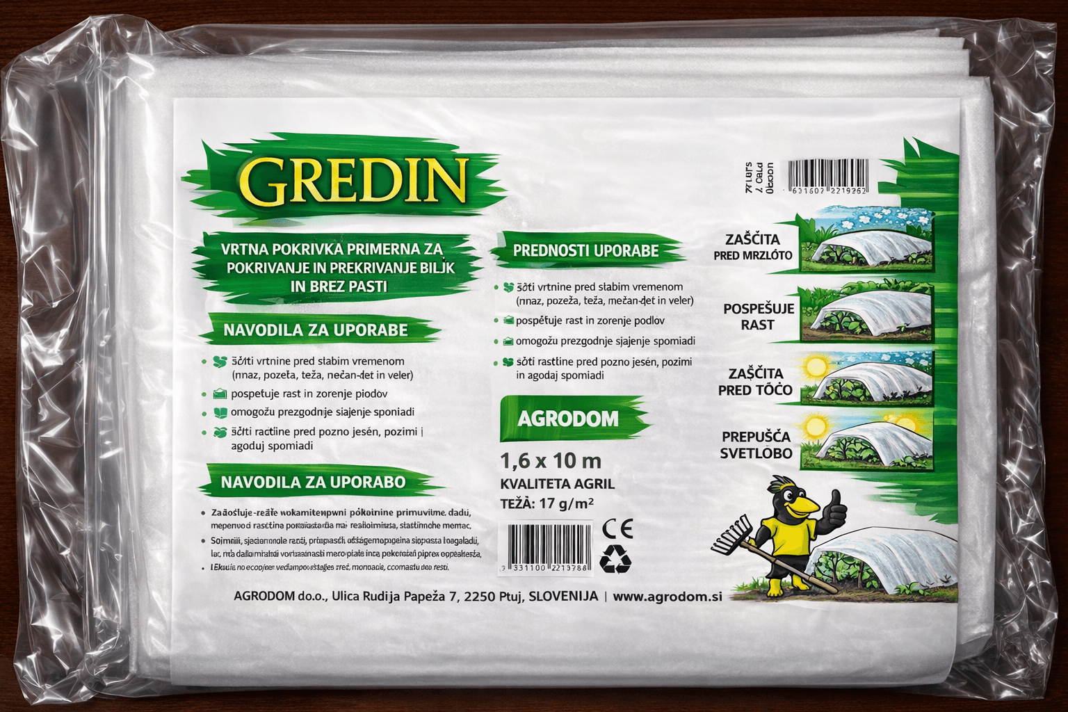 Uporabimo jo kot zaščito pridelka pred ekstremnimi vremenskimi razmerami, kot sta toča in močan dež, predstavlja pa tudi fizično zaščito pred insekti in drugimi živalmi.